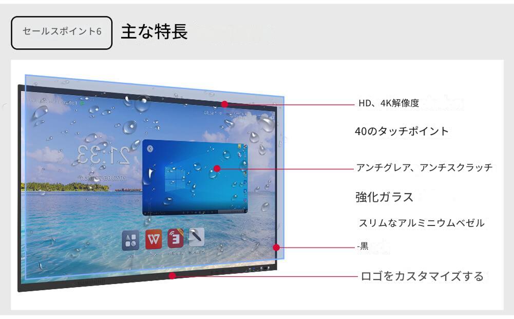 4K Ultra HDタッチスクリーンインタラクティブホワイトボードは、高解像度でインタラクティブな操作が可能なデジタルディスプレイです。教育現場やビジネスシーンでの効率的なコミュニケーションやコラボレーションを実現します。