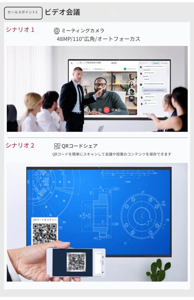 モーションセンサー、NFC機能、空気質検出、タッチペン検出、指紋認証、20Wサブウーファー、ホワイトボードソフトウェア(Smartboard/Qboard)、DMS管理機能