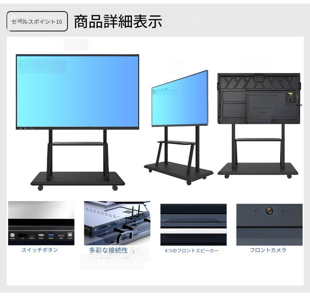 オプション機能 可動スタンド、スマートペン、ワイヤレスプロジェクター、教師用ポインター、HDMIケーブル(3m/5m/10m)、USBケーブル、外部カメラ、