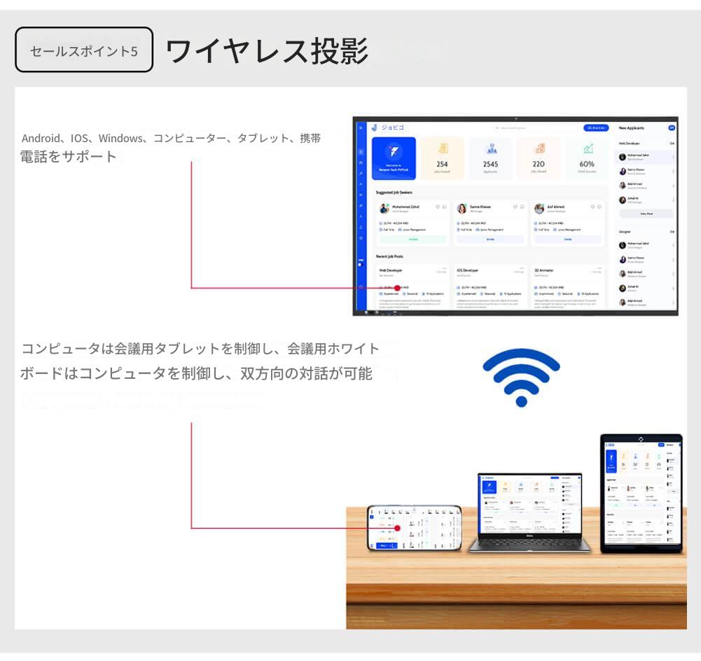 • 使いやすいインターフェース:ワイヤレスプロジェクション機能を活用し、複数のデバイス間でシームレスに画面共有が行えます。