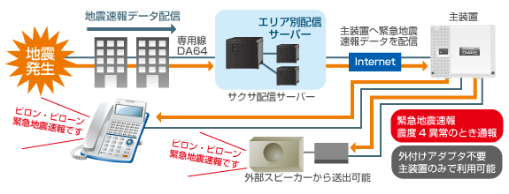 PLATIAは気象庁から配信される緊急地震速報(高度利用者向け)に対応し、地震発生時には速やかに電話機から表示と音声と光でお知らせします。 サクサが運営するサーバから配信しますので、PLATIAだけでご利用いただけます(外付アダプタは不要)。