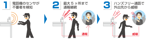 不審者が侵入した際、大音量の警報と電話機LEDランプで威嚇。同時に通報先へ異常を即座に知らせることができます。ネットワークカメラによる画像監視や外出先の電話から音声で威嚇することも可能です。また、セーフティセット忘れ防止機能もつき、あらかじめ設定した時間にセーフティモードにセットできます。