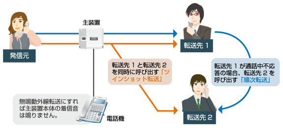 外線からの着信を、あらかじめ登録されている2ヶ所の転送先へ順番に転送することができます。 最初の転送先が通話中の場合、または一定時間応答しない場合は次の転送先を呼び出します。